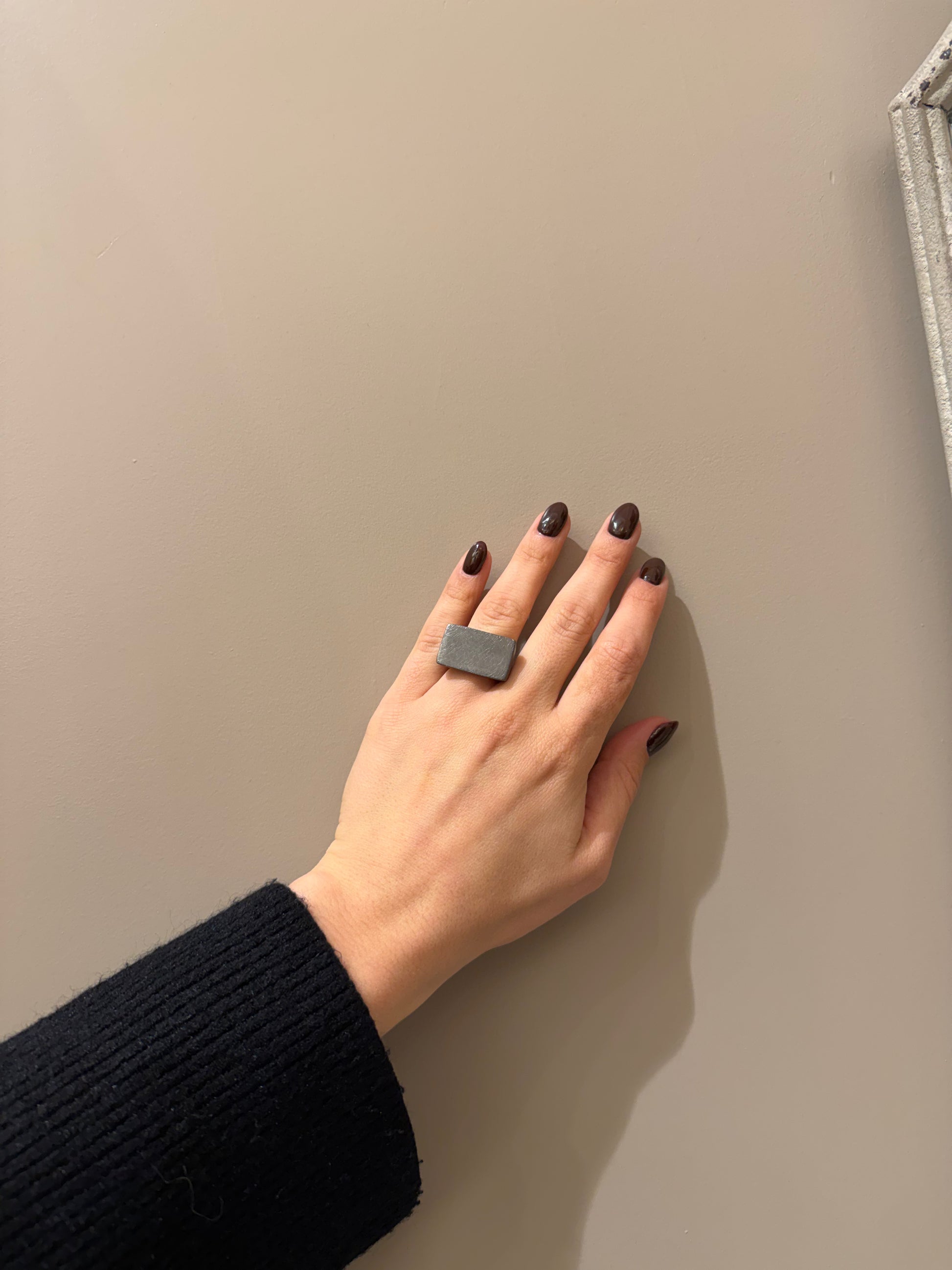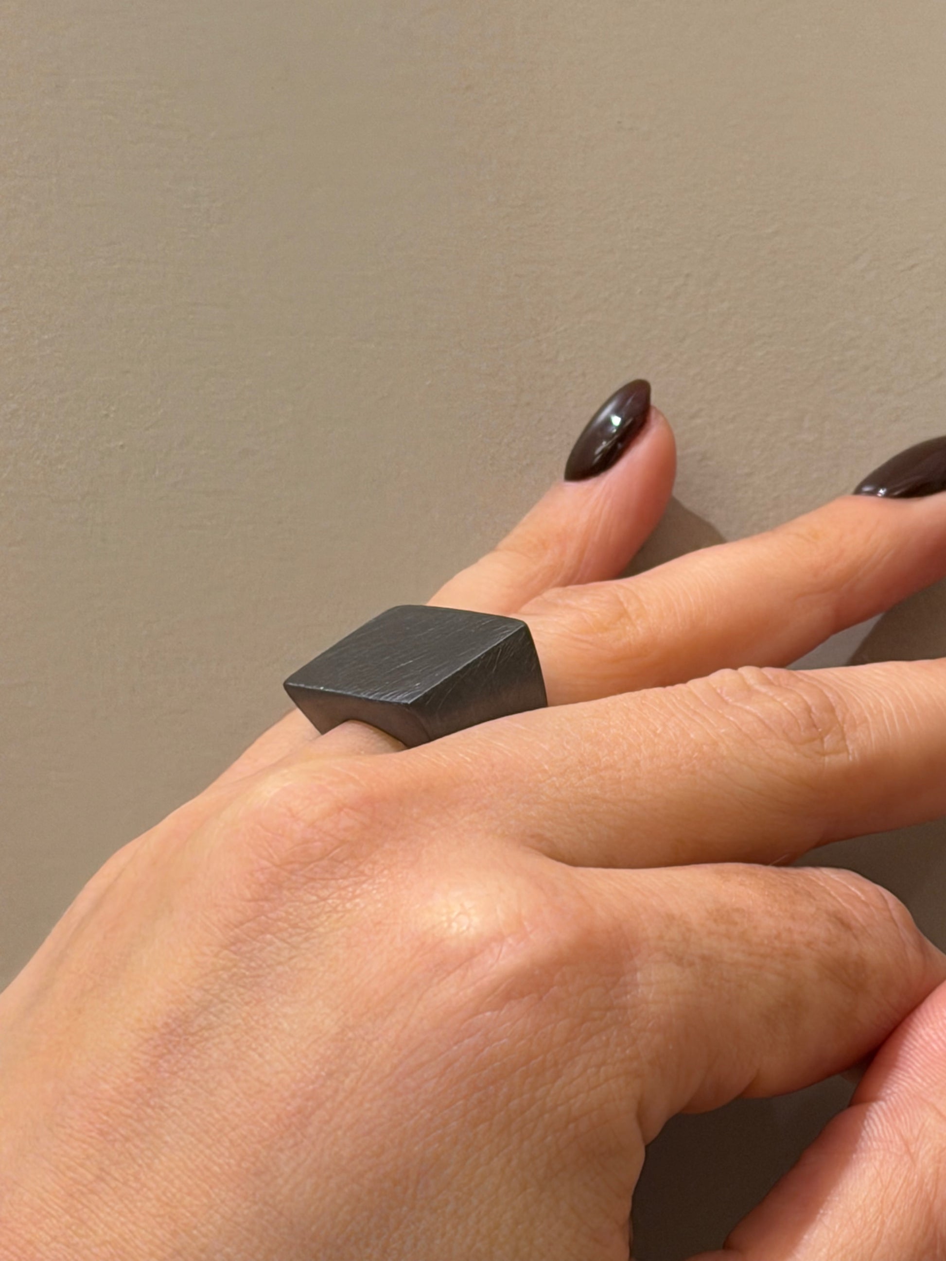 Anello dal design geometrico e moderno, caratterizzato da una forma rettangolare e una finitura opaca color antracite. Minimal ma d’effetto, è l’accessorio ideale per aggiungere un tocco contemporaneo e deciso al look.