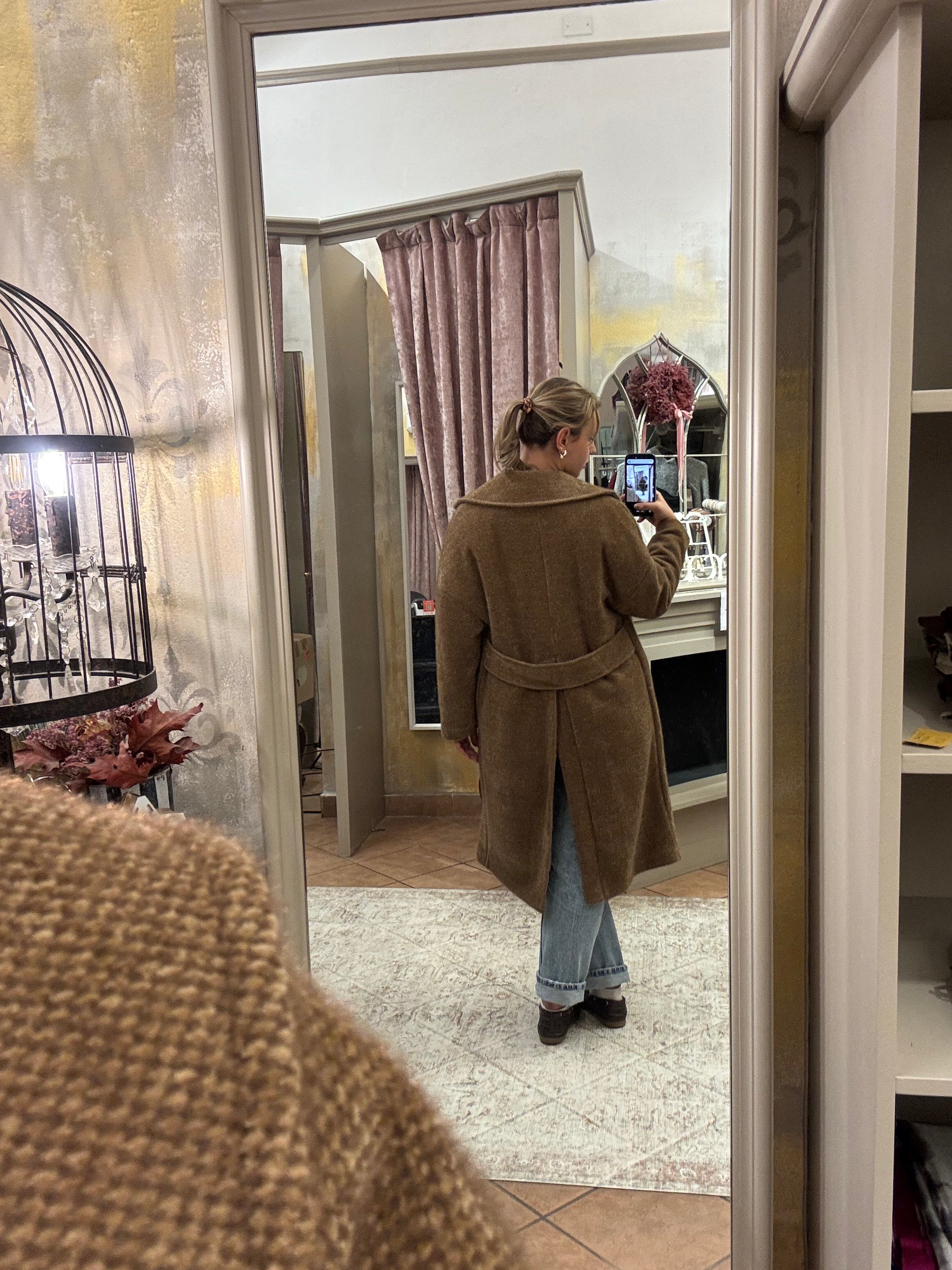 Cappotto dal taglio dritto e dalla linea essenziale, realizzato in morbido misto lana color cammello. La texture bouclé dona al capo un aspetto caldo e avvolgente, perfetto per la stagione fredda. Il design presenta ampi revers, tasche laterali e una fascia applicata sul retro che aggiunge un dettaglio sartoriale senza appesantire la silhouette. Un modello versatile, facile da abbinare sia a look casual con jeans e maglioni, sia a outfit più eleganti per un’eleganza quotidiana.