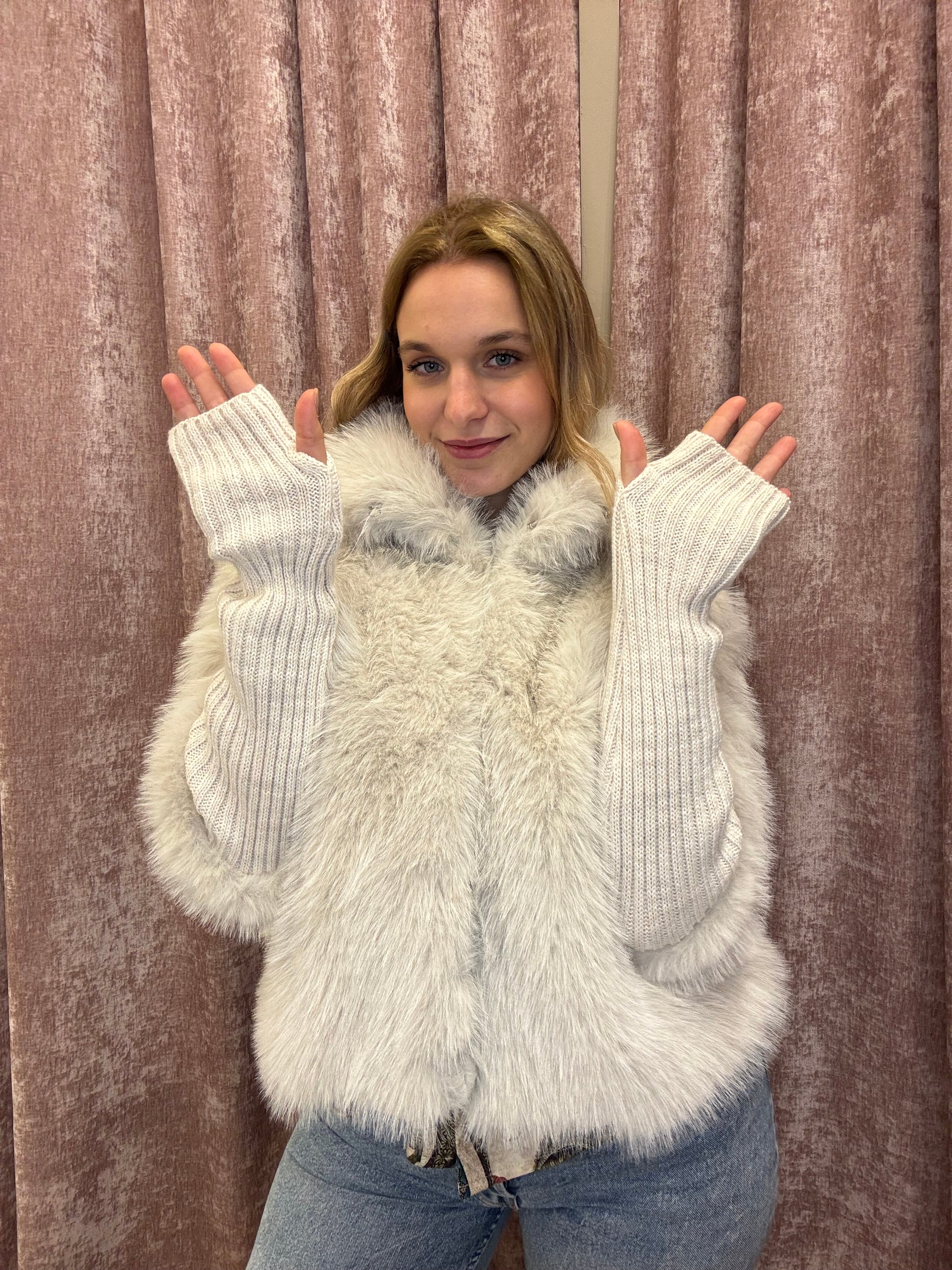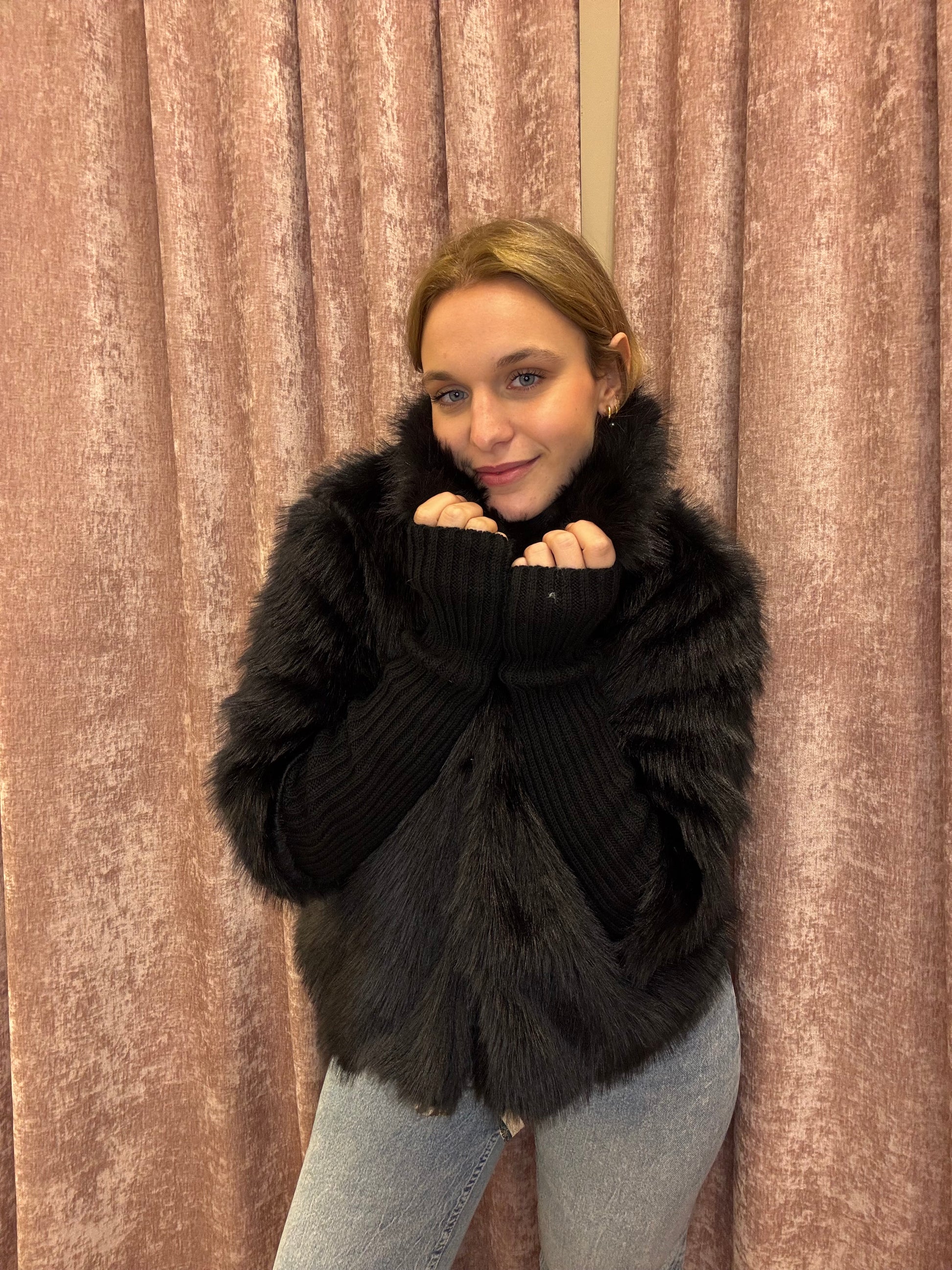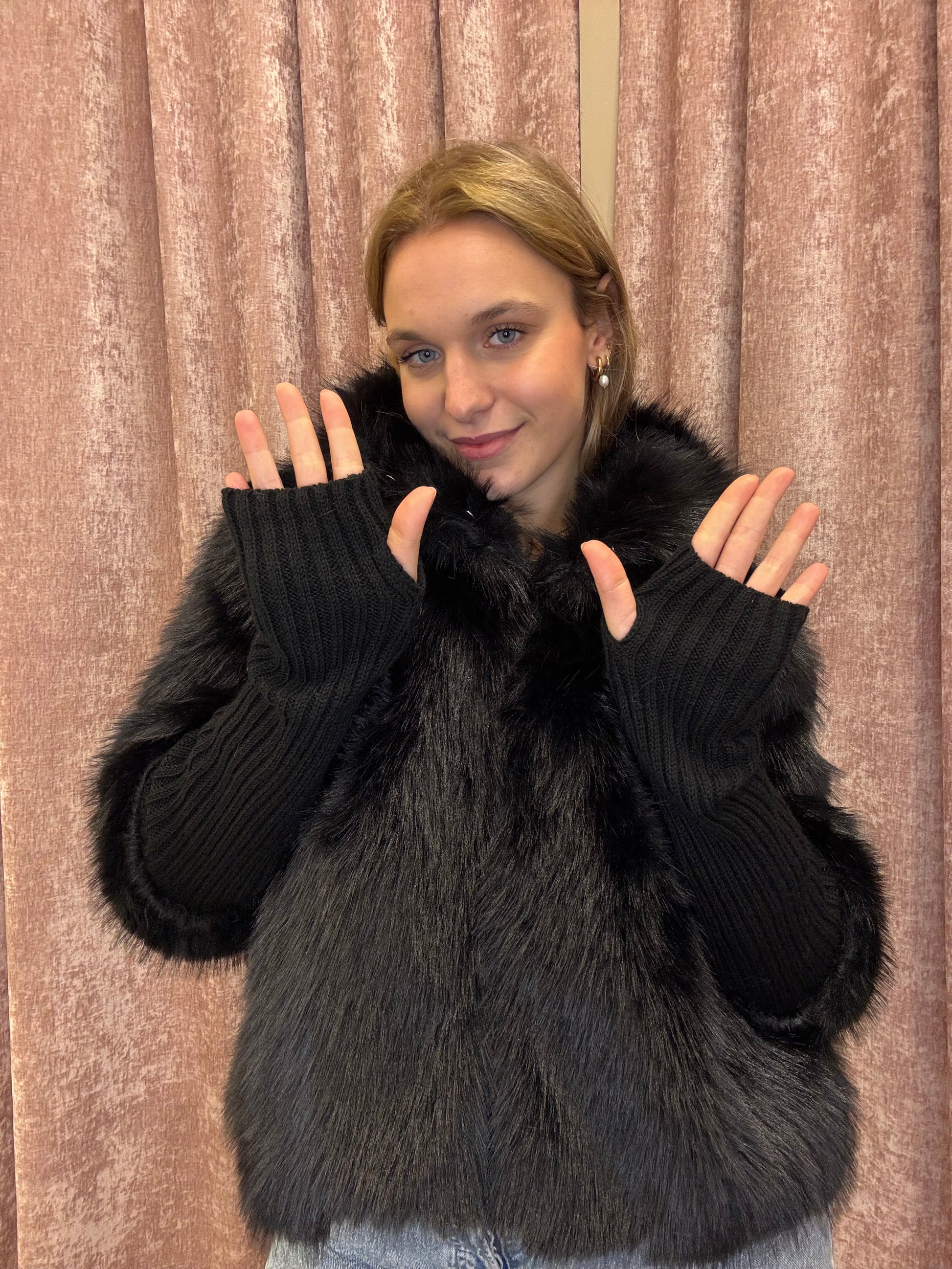 Morbida e avvolgente, questa eco pelliccia unisce eleganza e praticità in un unico capo. Il design presenta una manica a tre quarti completata da un manicotto in lana con fessura per il pollice, ideale per proteggere le mani nelle giornate più fredde. Il collo alto e la chiusura fino in cima assicurano massimo comfort e calore, rendendola perfetta per un look sofisticato e contemporaneo.