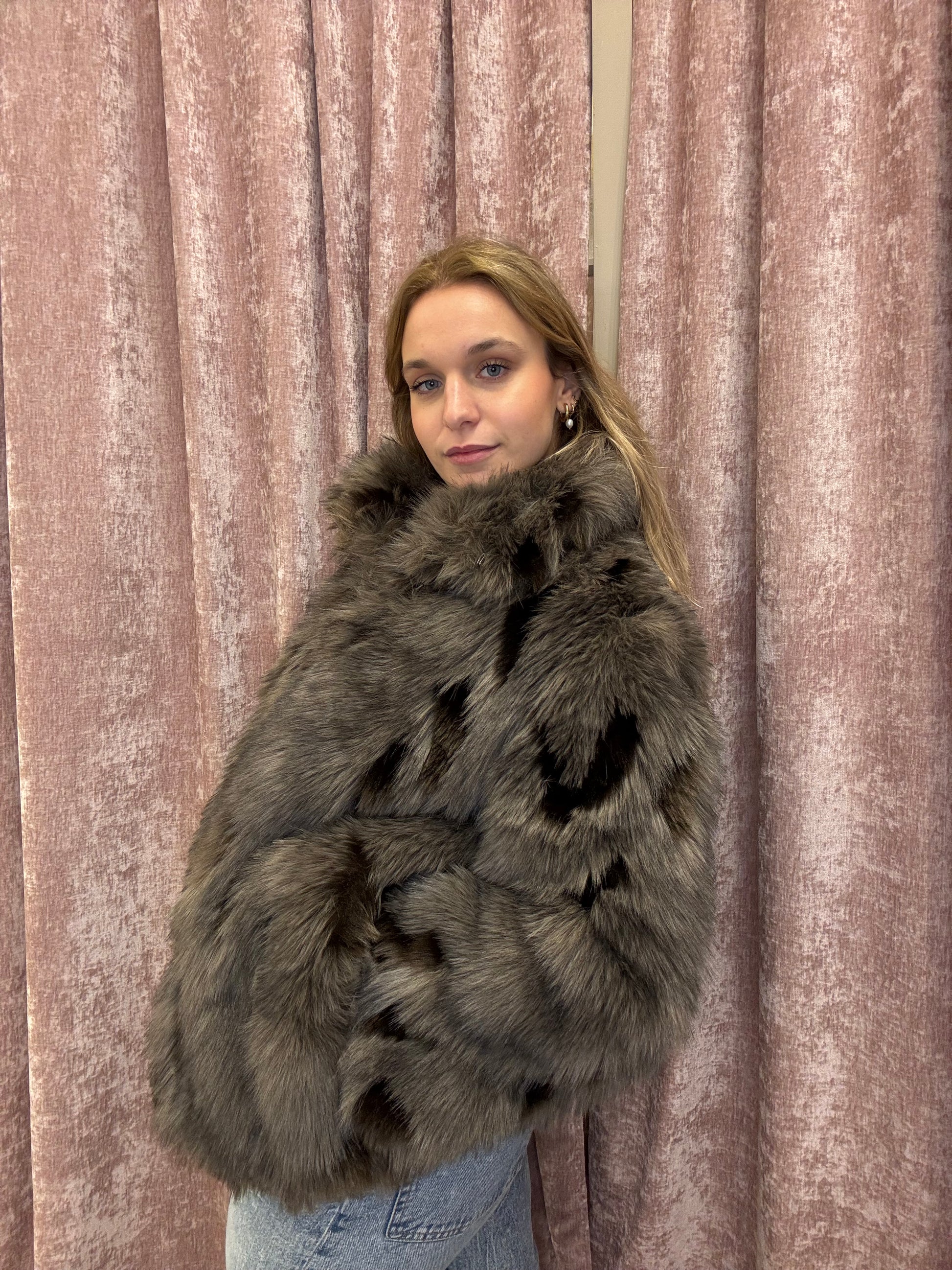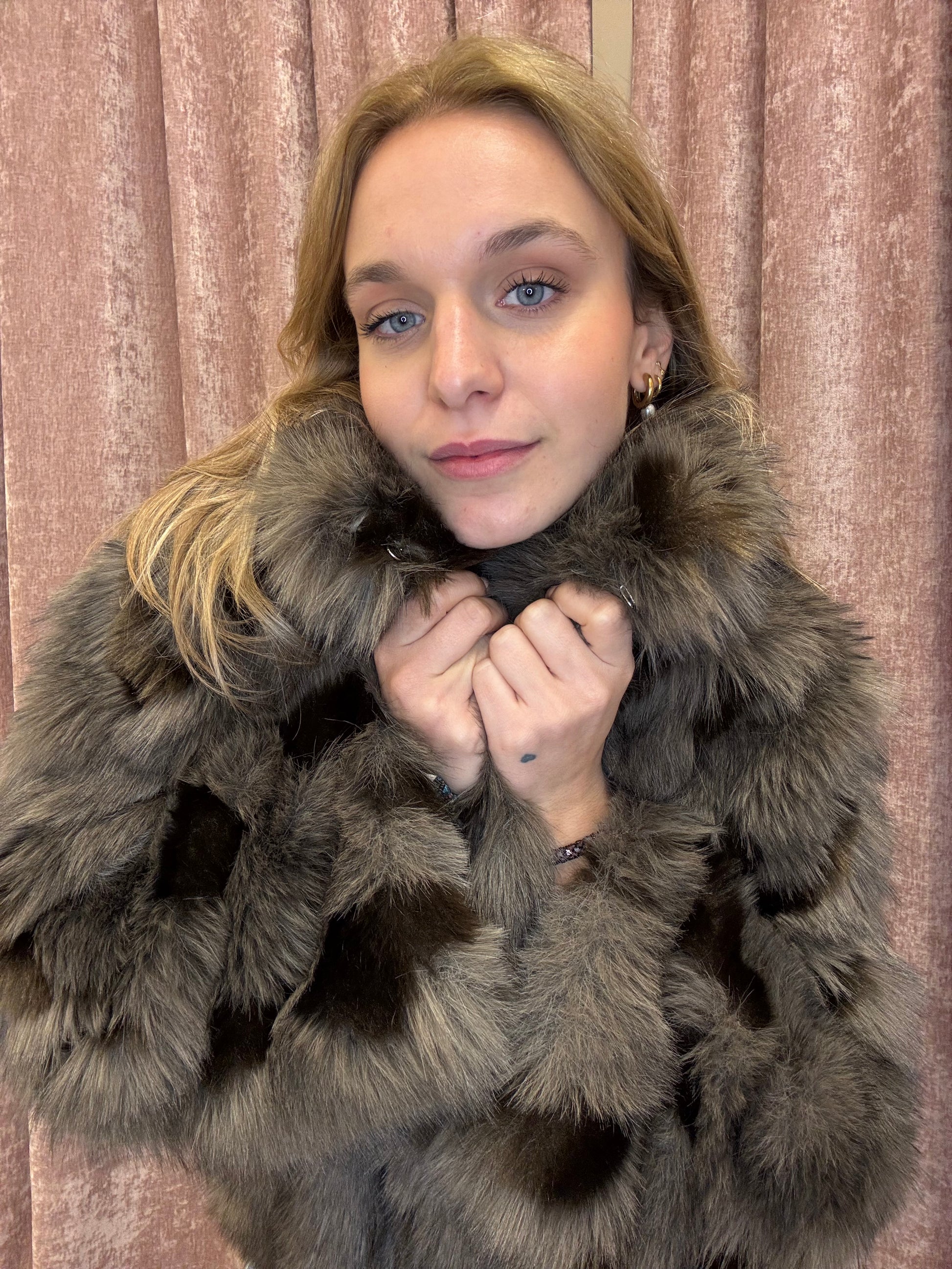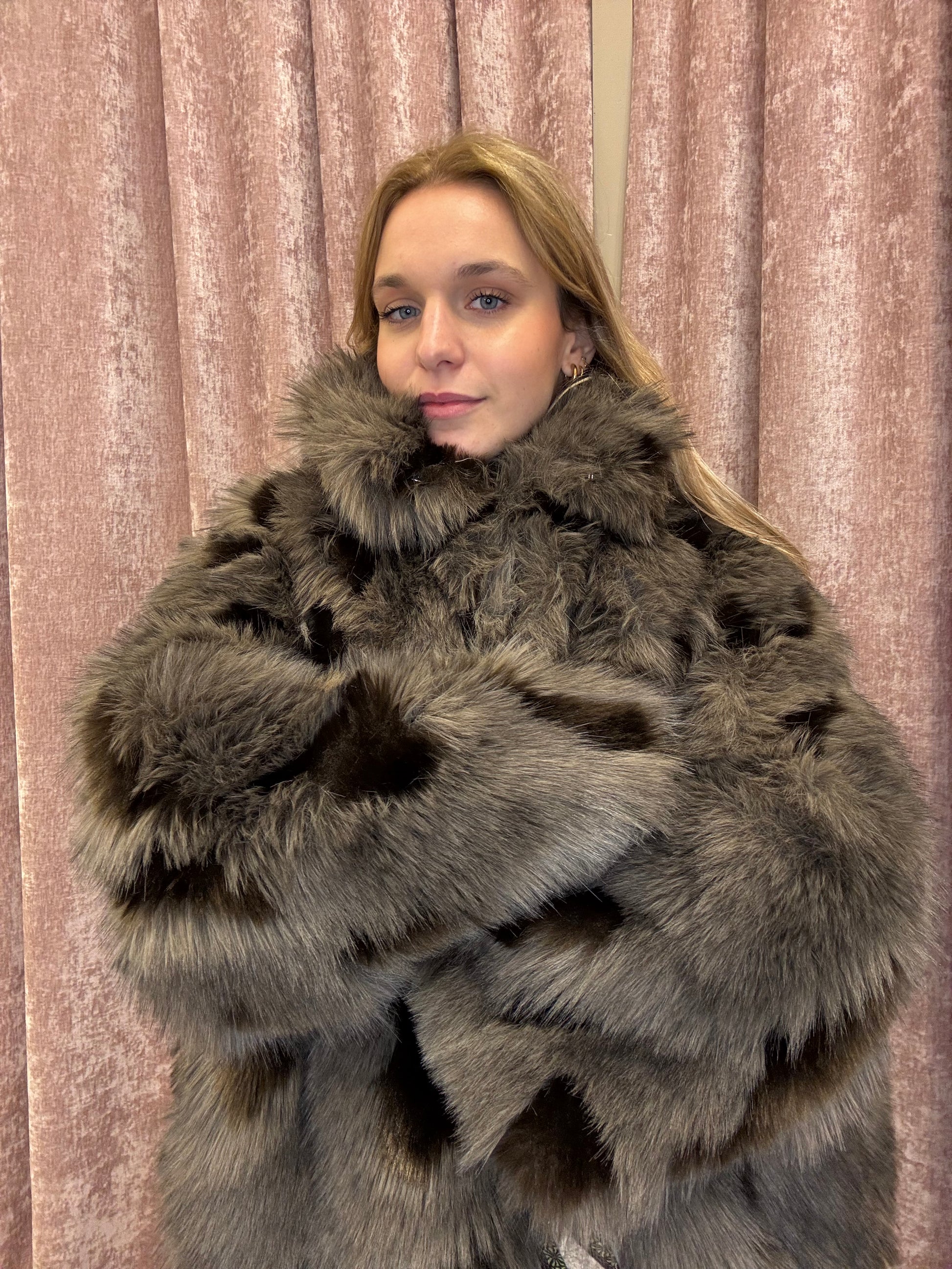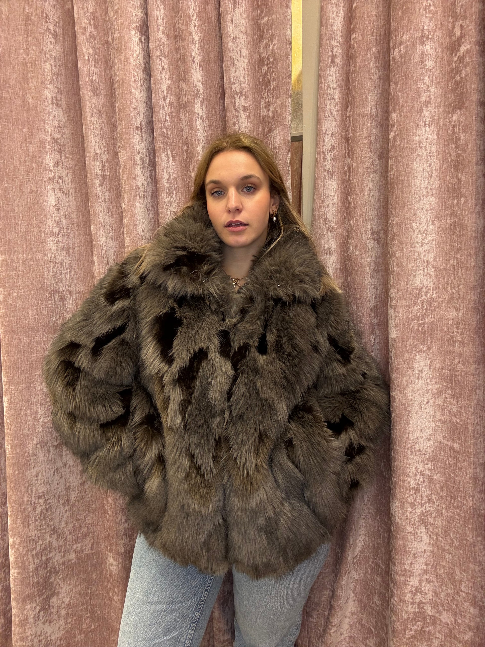 Raffinata e avvolgente, questa eco pelliccia presenta una base grigio caldo impreziosita da macchie grigio scuro, marroni e beige che creano un effetto naturale e sofisticato. Il pelo lungo e morbidissimo dona un aspetto elegante e una sensazione di comfort assoluto. Dotata di tasche laterali, chiusura classica invisibile e collo alto, è il capo perfetto per affrontare l’inverno con stile e personalità.