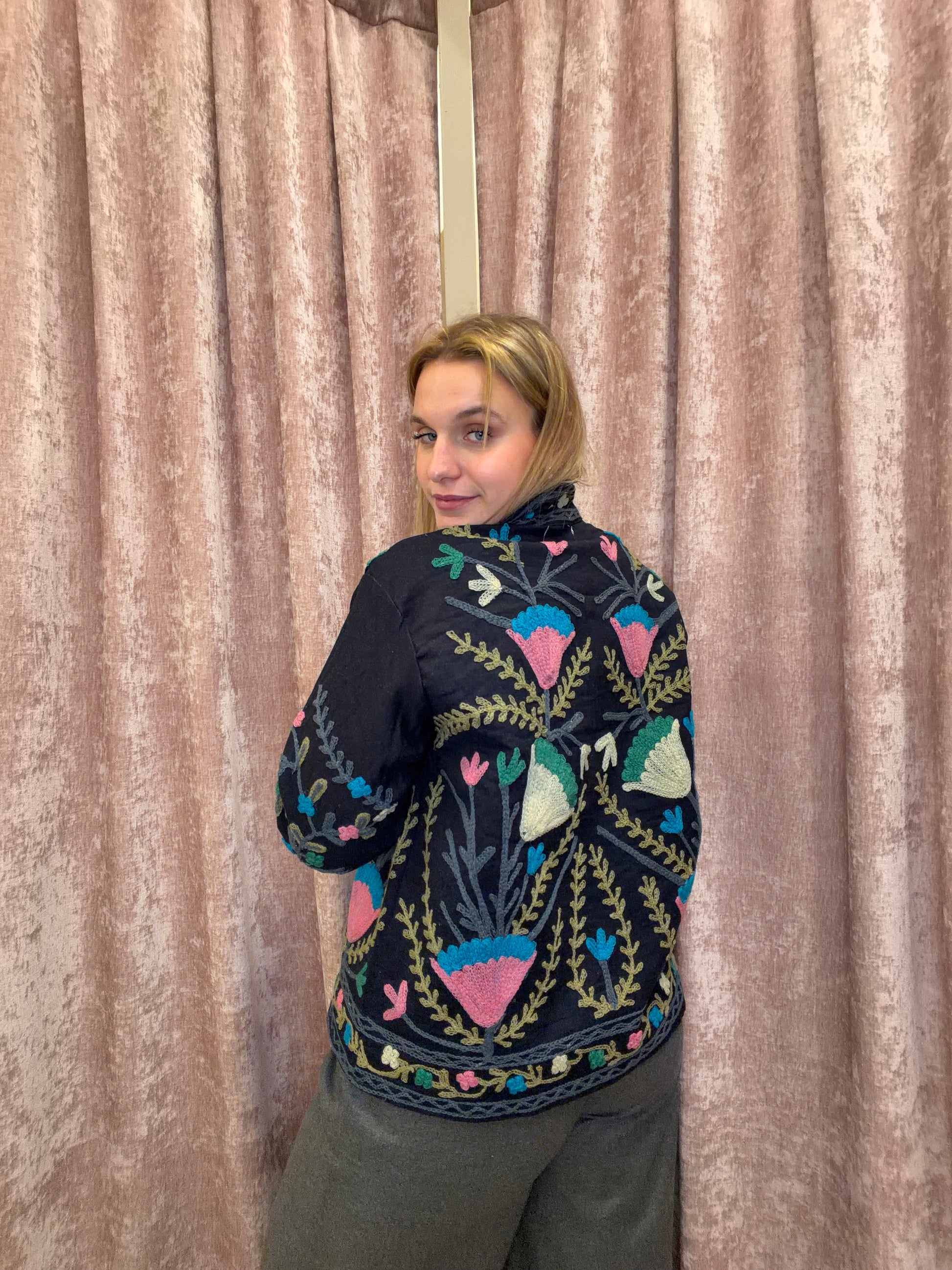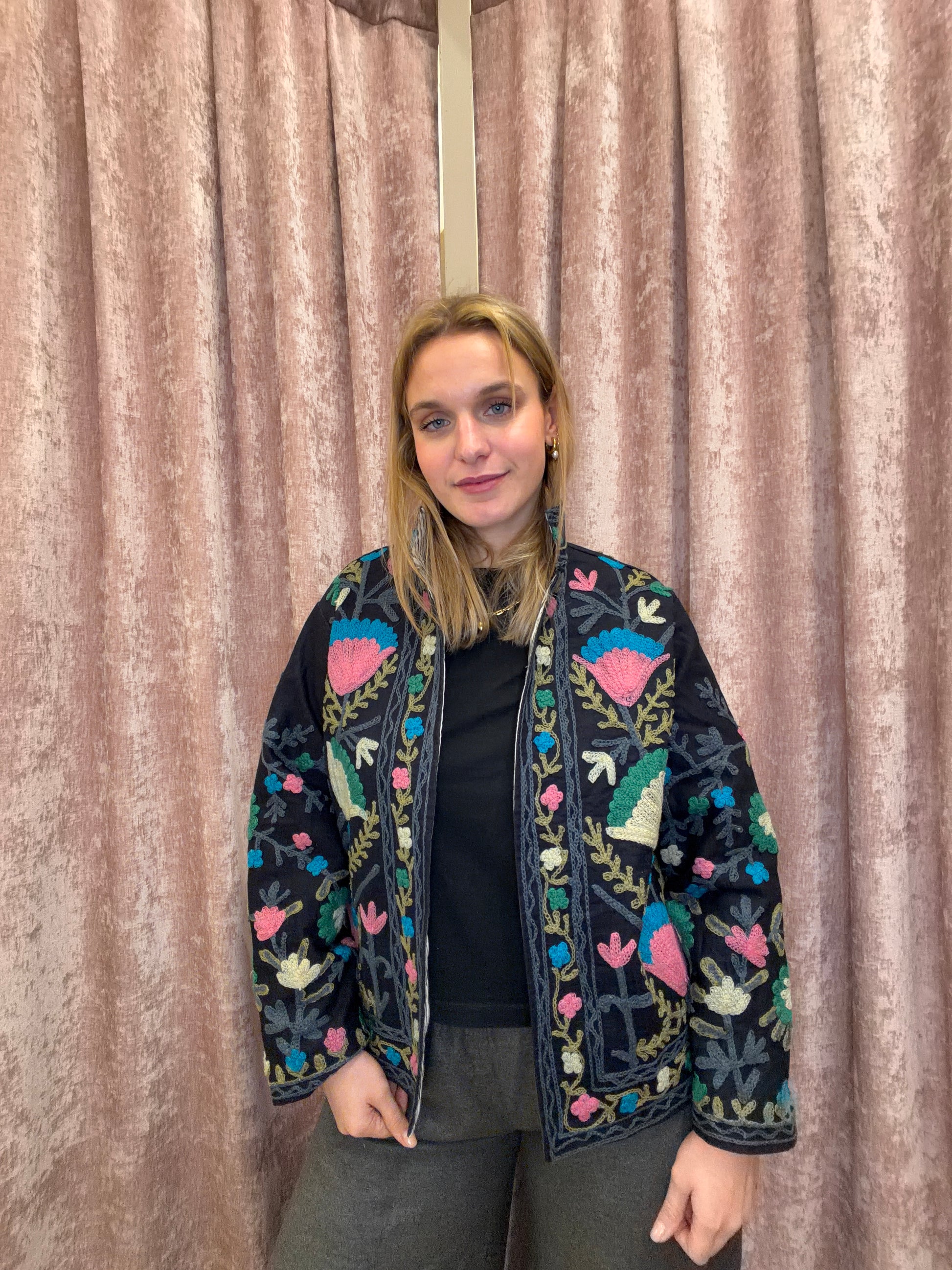 Un capo che conquista al primo sguardo grazie ai suoi ricami colorati e alle ispirazioni etniche. Ogni giacca è realizzata artigianalmente, con motivi floreali e geometrici che rendono ogni pezzo unico. Perfetta per aggiungere un tocco boho e raffinato ai tuoi look di tutti i giorni, si abbina facilmente a jeans, pantaloni o abiti. Disponibile in diverse varianti di colore e fantasia.