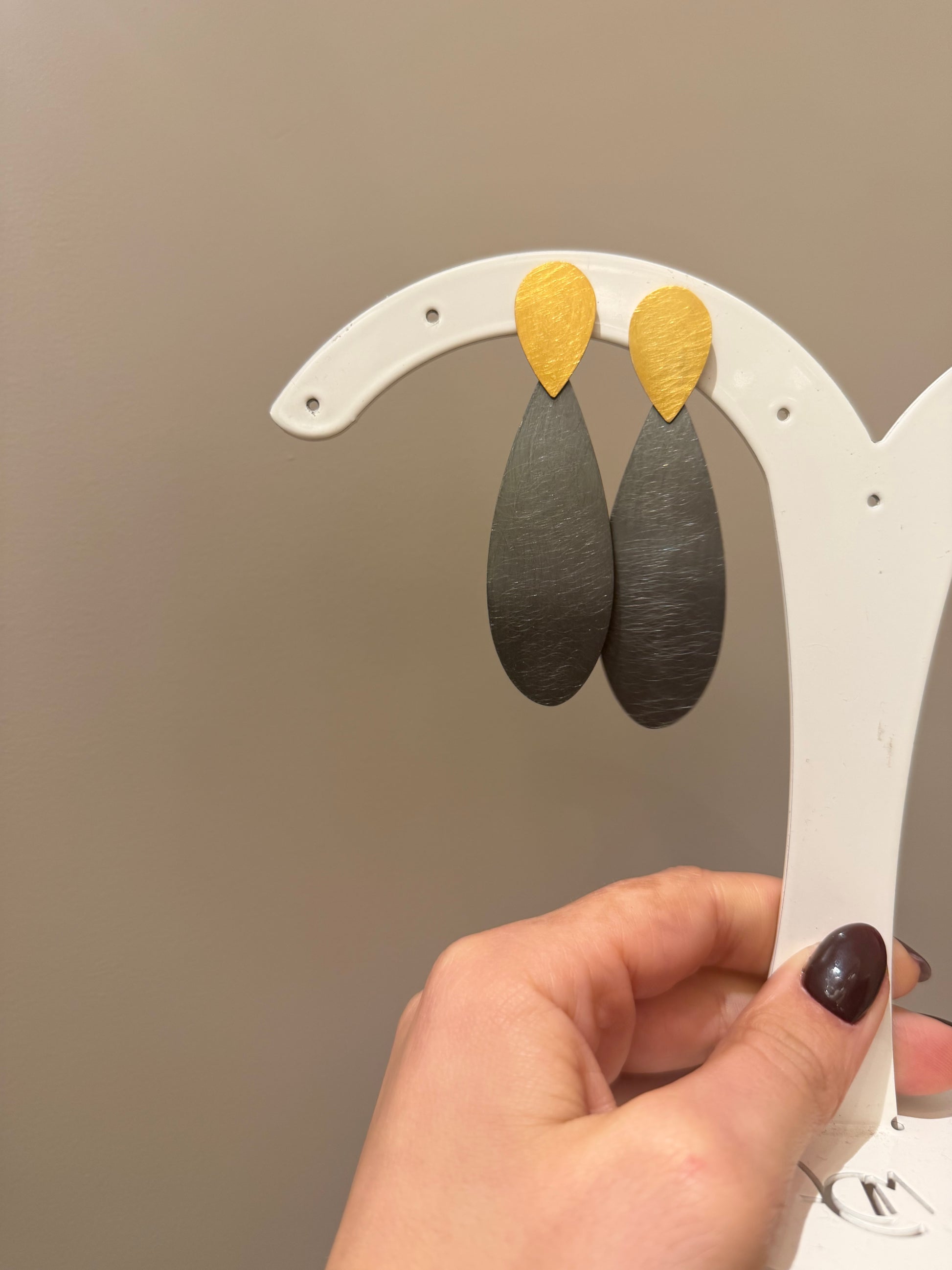 Orecchini dorati con perno e chiusura a farfallina, caratterizzati da due elementi a forma di goccia: una più piccola che si appoggia al lobo e una più grande pendente sottostante. Il design elegante e fluido dona luce e movimento al viso, perfetto per completare look sia casual che raffinati.