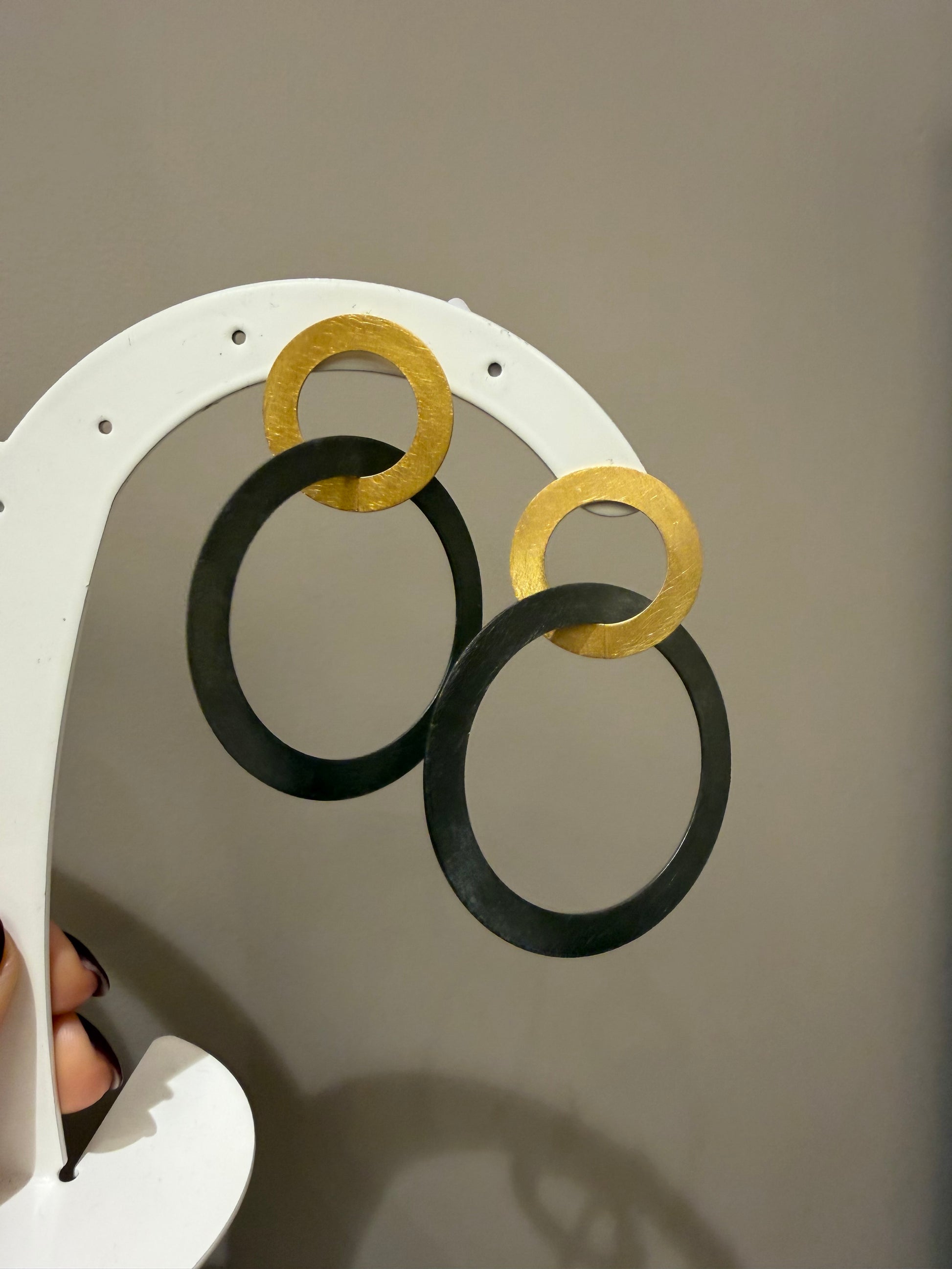 Orecchini con perno e chiusura a farfallina, composti da due cerchi intersecati: uno più piccolo in finitura dorata e uno più grande in argento. Il contrasto tra i metalli crea un equilibrio raffinato e contemporaneo, ideale per aggiungere un tocco di luce e movimento al viso.