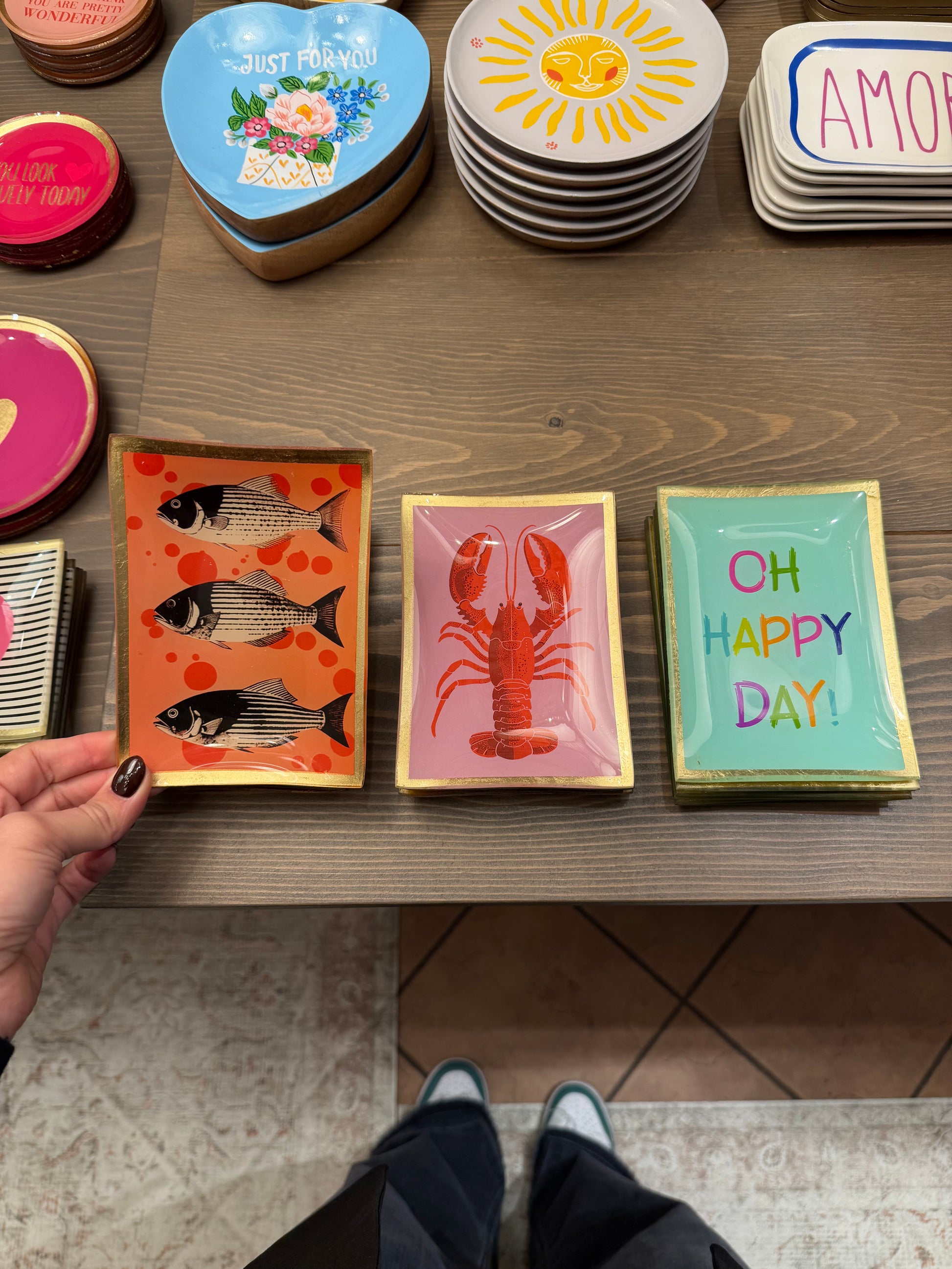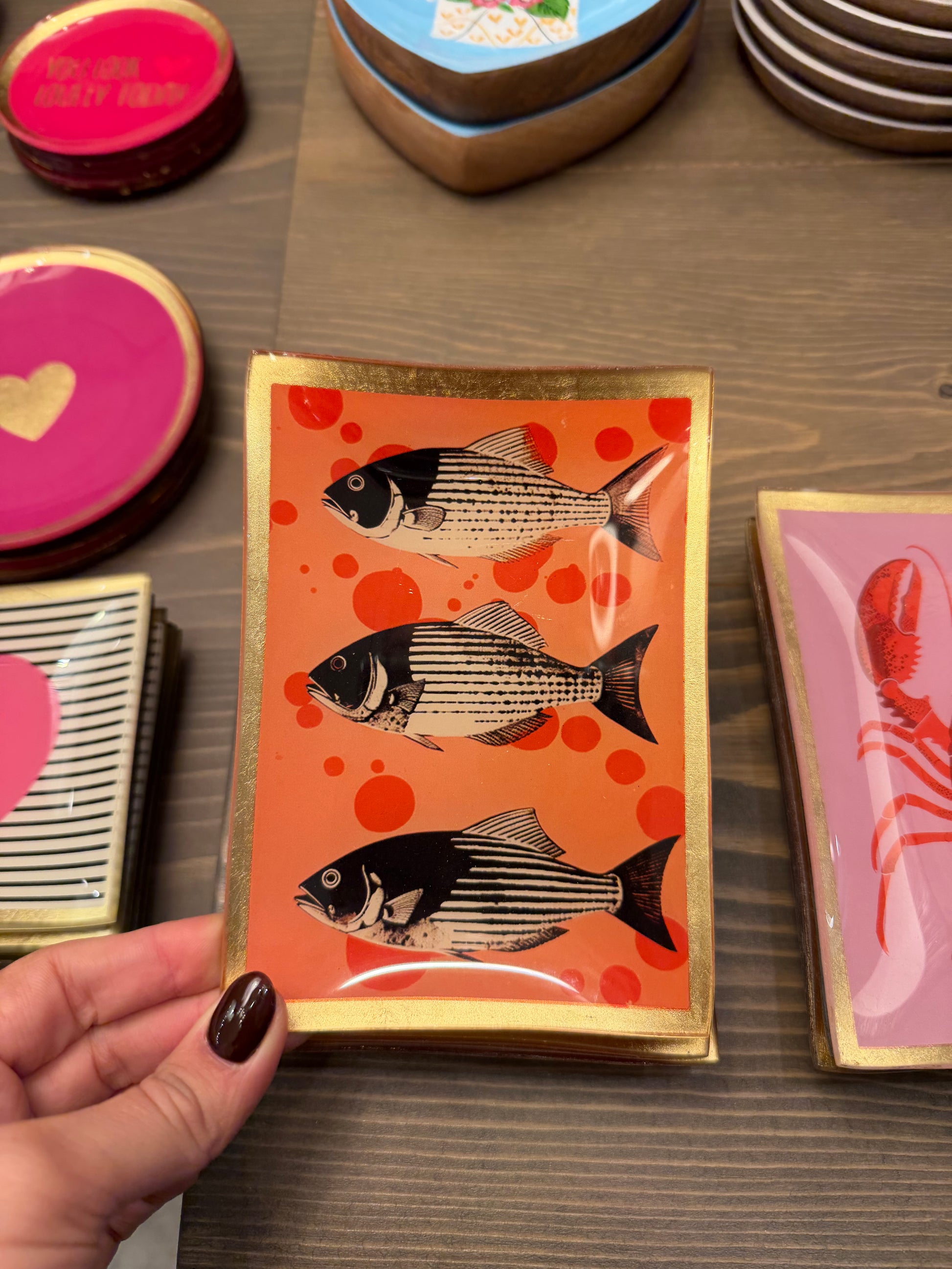 - Pesci su fondo arancio: piattino rettangolare con stampa di pesci stilizzati in bianco e nero su sfondo arancio con pois, ideale per un tocco marino moderno.