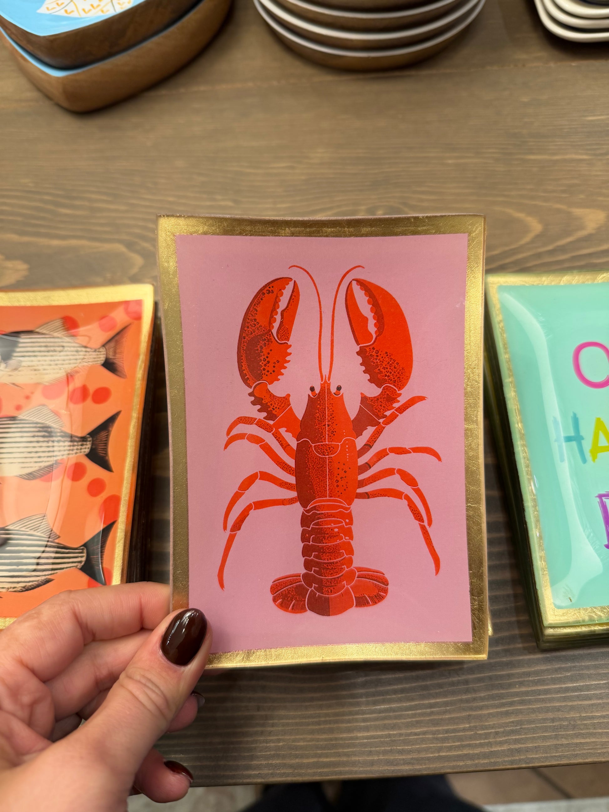 - Aragosta su fondo rosa: design ironico e deciso con una grande aragosta rossa che spicca sullo sfondo rosa pastello.