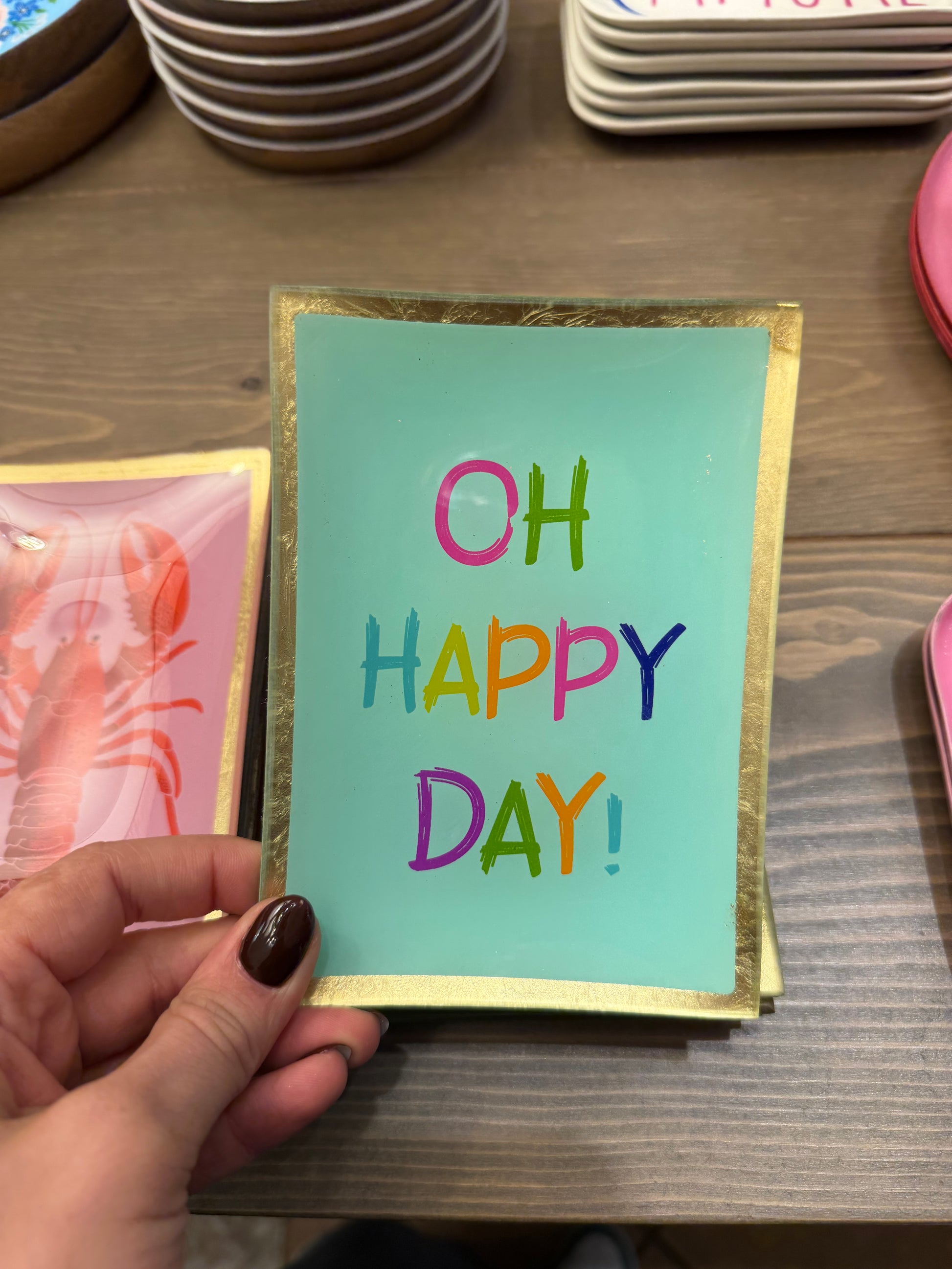 - “Oh Happy Day!” su fondo verde acqua: piattino allegro e luminoso con frase colorata perfetta per portare un po’ di buonumore in ogni ambiente.
