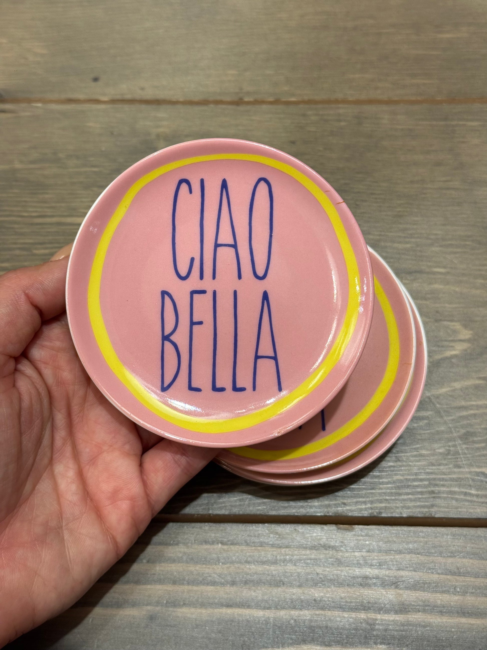 Piattini artigianali in ceramica con frasi e grafiche colorate che trasmettono positività e buonumore. Ogni pezzo è unico, con piccole variazioni che ne esaltano il carattere autentico e creativo.