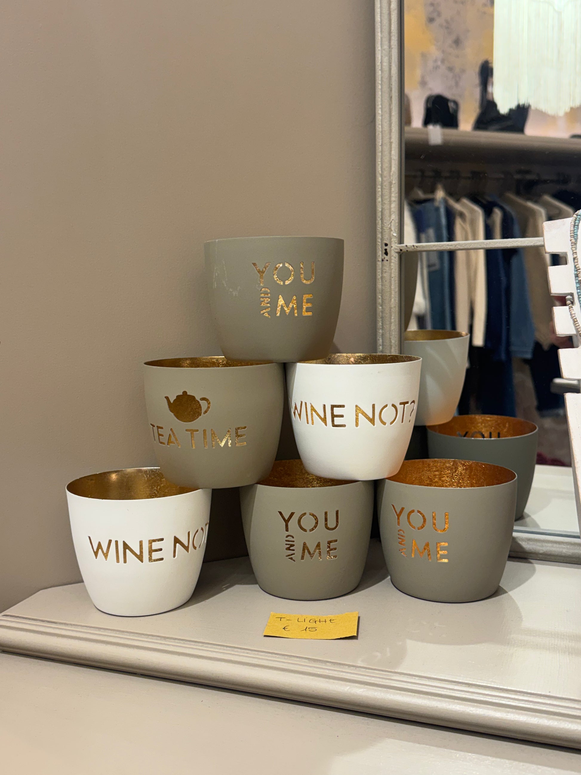 Eleganti porta candele T-light in metallo con interno dorato che, una volta accesa la candela, diffonde una luce calda e luminosa creando un’atmosfera raffinata e accogliente.
